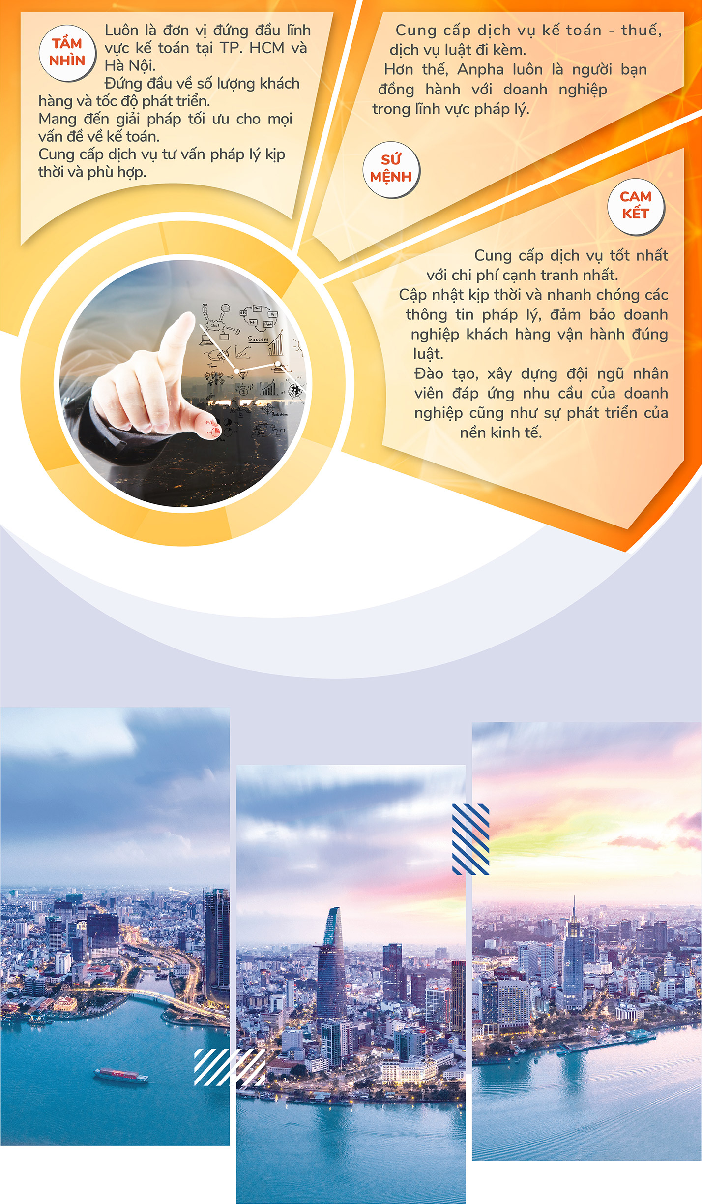 Ngày nay, từ một công ty trẻ, quyết tâm và đầy tham vọng, Kế toán Anpha đã có mặt tại 5 tỉnh, thành phố của Việt Nam. Mỗi năm, chúng tôi hỗ trợ hơn 20.000 doanh nghiệp vừa và nhỏ hoạt động hiệu quả, đúng pháp luật, chuyên sâu về các gói dịch vụ: tư vấn thủ tục pháp lý về thành lập doanh nghiệp, thay đổi giấy phép kinh doanh, kê khai, quyết toán thuế… và trở thành đơn vị đứng đầu trong lĩnh vực Kế toán và Pháp lý tại Hà Nội, TP. HCM và Đà Nẵng.